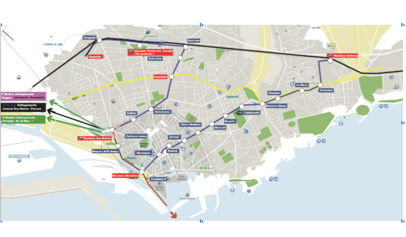 Tracciato tranviario cittadino che potrebbe essere messo in connessione con la prevista tranvia a Pisa verso Cisanello, connessione da realizzarsi utilizzando l’attuale linea ferroviaria. In tal modo troverebbe una più efficace applicazione la modalità del tram treno, differentemente dall’ipotizzato tracciato parallelo della tranvia dei Navicelli, proposto per il Next Generation.