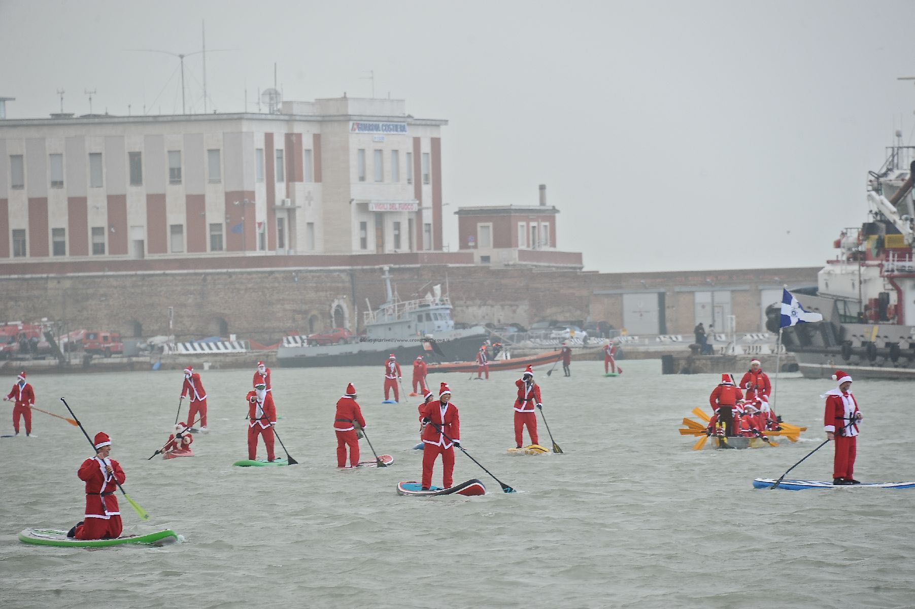 ANCONA- Sono arrivati dal mare, sfidando la tempesta, perché i Babbi Natale non li ferma nessuno. Sui loro sup e canoe, dal Porto Antico sono sbarcati alla banchina 10, di fronte alla portella Santa Maria, per una staffetta simbolica fra mare e terra nel segno della solidarietà espressa da tutta la comunità portuale in questa manifestazione creata dalle associazioni Amici del porto antico e Stella Maris, insieme a Comune di Ancona, Capitaneria di porto di Ancona e Autorità di sistema portuale del mare Adriatico centrale.