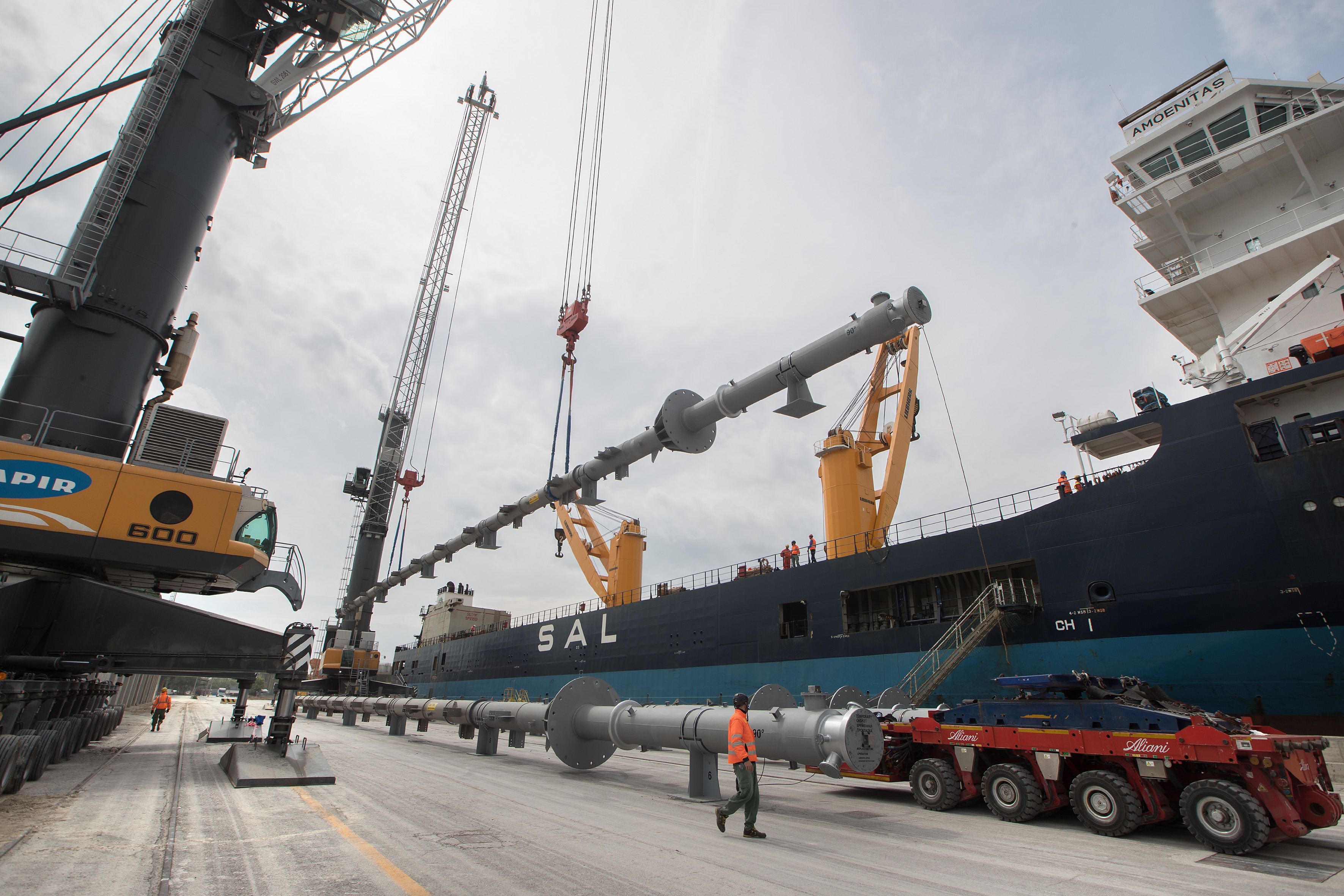 RAVENNA- Importante operazione di imbarco a Ravenna al terminal Sapir, 8 tubi (tecnicamente “reactor legs”) di 70 metri di lunghezza e 63 tonnellate di peso ciascuno, assemblati nelle scorse settimane in area portuale, sono stati imbarcati sulla nave Amoenitas diretta ad Anversa, l’impiantistica poi dallo scalo belga proseguirà via terra con destinazione finale la Siberia. A questo imbarco nello scalo ravennate seguiranno altre due analoghe operazioni programmate nelle prossime settimane, in totale saranno 24 i tubi che attraverso il porto adriatico raggiungeranno la Siberia per la costruzione di un impianto di polimeri.
